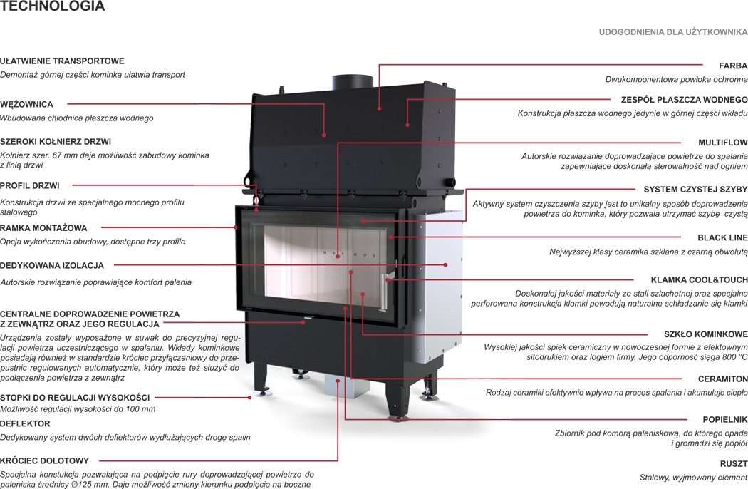 Seria wkładów wodnych RIVA jest przystosowana do intensywnego palenia. Zastosowana w nich technologia płaszcza wodnego, wykorzystuje ciepło, które daje nam kominek, podgrzewając wodę i przekierowując je na użytek centralnego ogrzewania. Z racji sezonowości okresu wykorzystywania kominka, wkłady wodne z serii Riva współpracują z innym źródłami ciepła, jak: kotły, piece, bojlery, systemy solarne, pompy ciepła, itp . Dlatego też serie Riva z płaszczem wodnym tworzą wkłady ekonomiczne i ekologiczne o wysokiej sprawności. Konstrukcja wkładu oparta na zespole wodnym jedynie w górnej części wkładu gwarantujący doskonały komfort palenia.