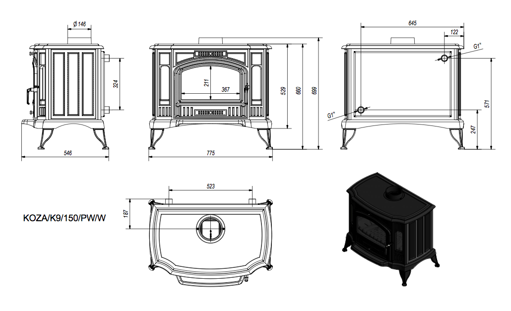Uwaga: W modelu Koza K9 z wylotem spalin fi 150 z wymiennikiem wodnym